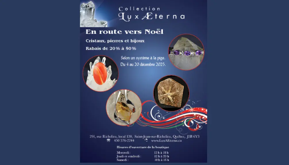 Profitez d’un rabais surprise de 20% à 50% sur tous les cristaux, pierres et bijoux en boutique. Une belle façon d’ajouter un peu de magie — et beaucoup d’économies — à vos emplettes festives!