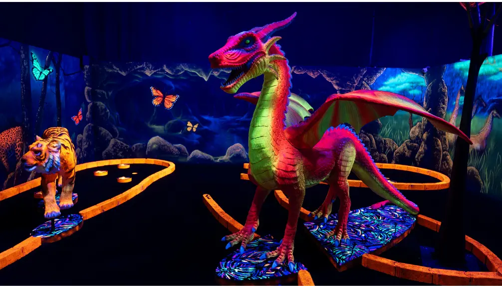 • Un mini golf 18 trous dans un univers jungle immersif, en mode jour ou en version fluo 3D