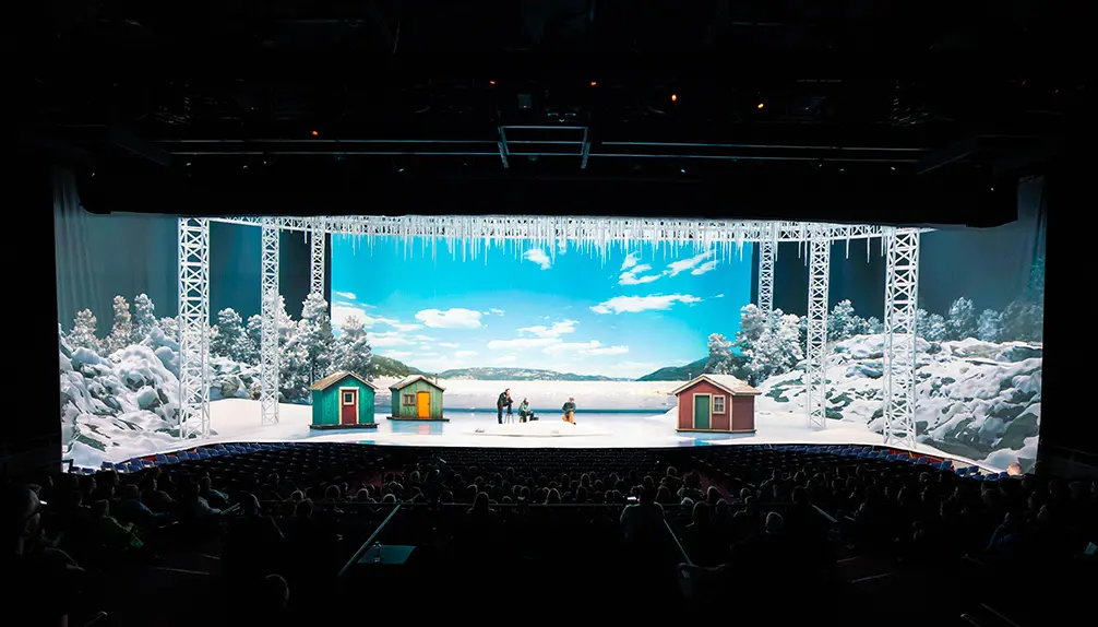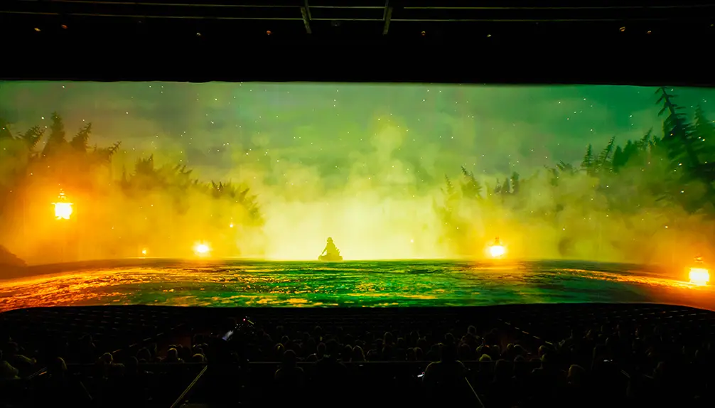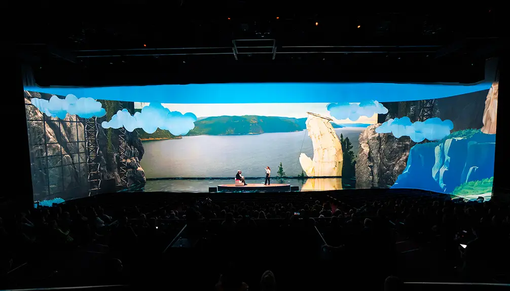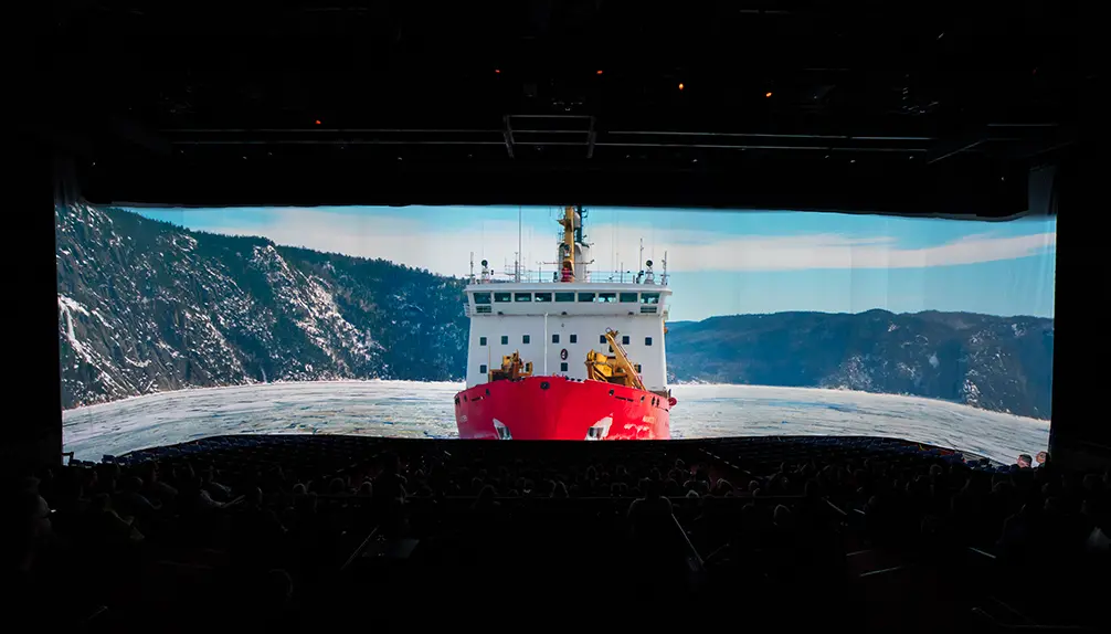 Un écran géant courbé et un système de son qui accentue la spatialisation immergent le public dans l’univers réel et fictif du fjord. Les faits scientifiques et historiques se confrontent ou s’entremêlent aux contes ancestraux et récits de la tradition orale.