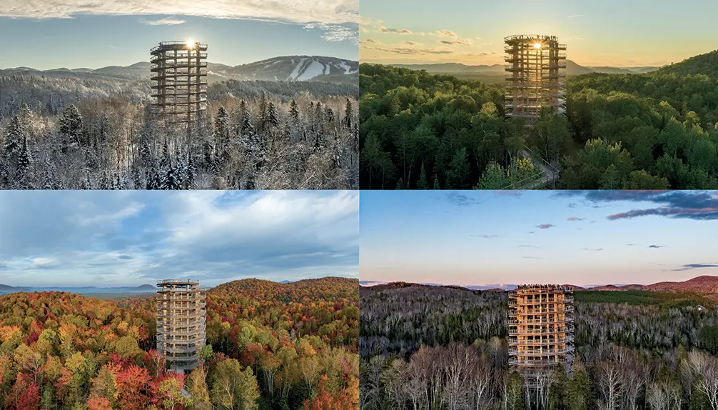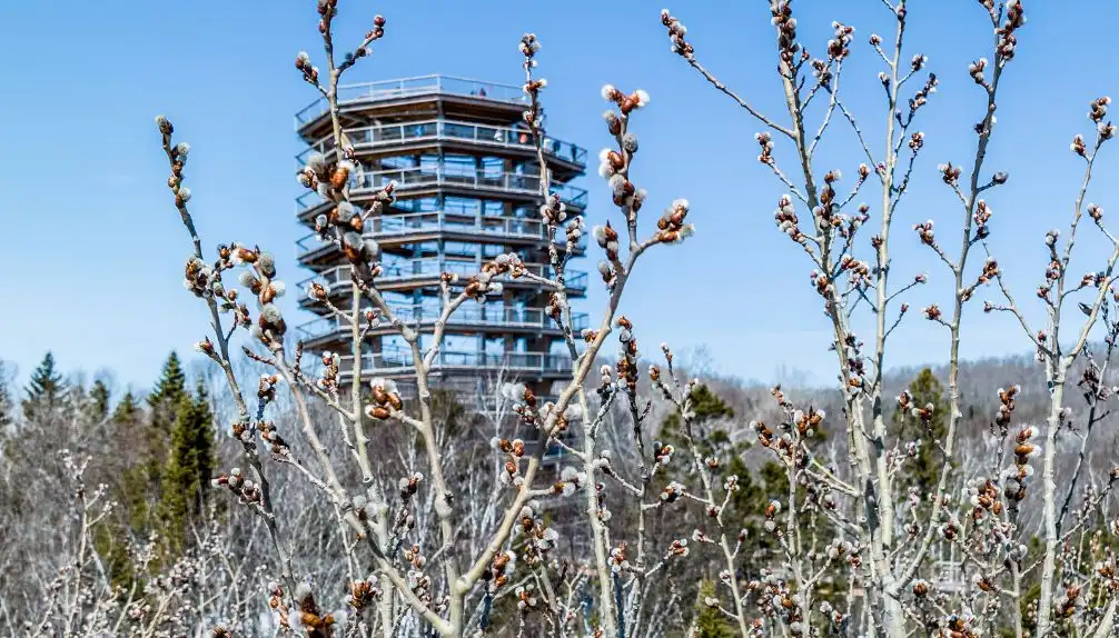 Au cœur d’un site patrimonial unique, la visite commence par une promenade sur une passerelle en bois à la cime des arbres, sécuritaire et accessible à tous. Elle culmine sur une tour panoramique de 40 mètres, où un filet suspendu au centre invite les visiteurs à vivre un moment suspendu au-dessus du vide.