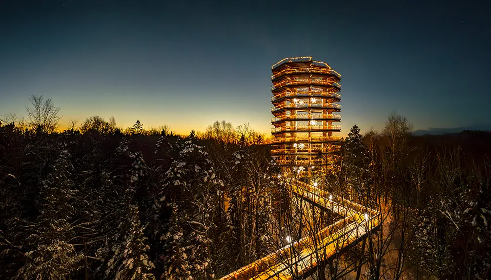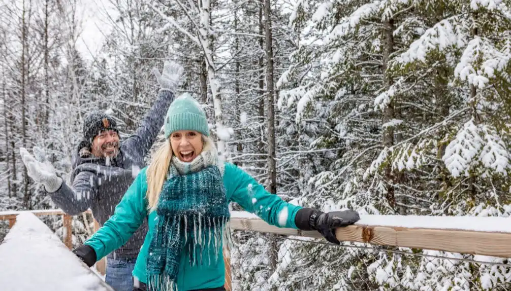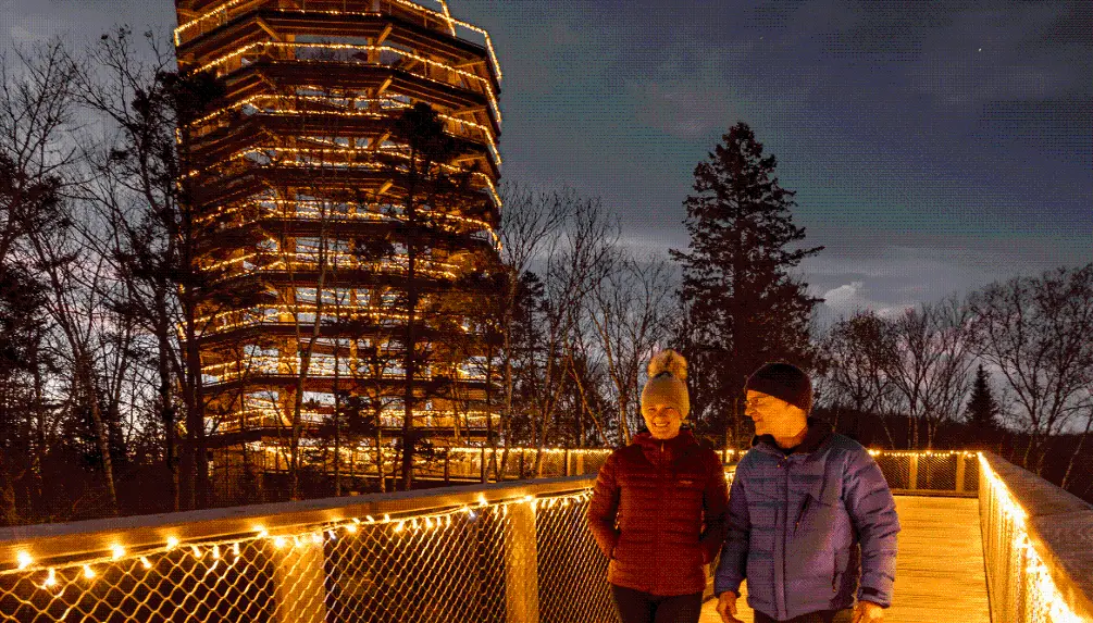 La forêt, la neige et la lueur des sculptures lumineuses créent une atmosphère chaleureuse et féérique. Une expérience simple, belle et apaisante, qui met la nature en valeur et invite petits et grands à savourer l’hiver autrement — en marchant à la cime des arbres dans un décor hivernal illuminé!